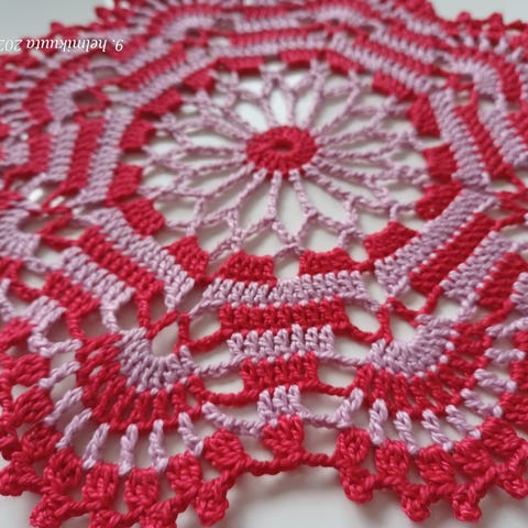 Virkattu pyöreä pitsiliina punavalkoinen