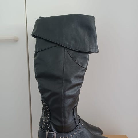 Zaran polviin ulottuvat saappaat. Koko 36. Materiaali tekonahkaa. Korkeus 46 cm ja korko n. 8 cm. Käytetty kerran.
