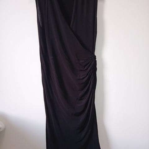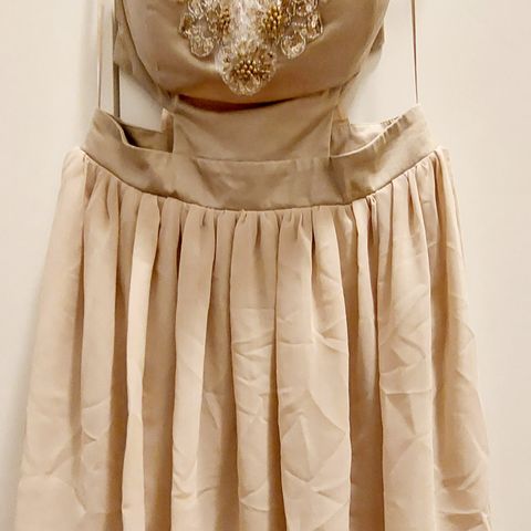 H&M juhla- tai cocktailmekko, koko M (EUR 40). Mekko on hihaton ja polvipituinen, väriltään ruskea. Edessä on laskoksia ja sivuilla väljyyttä tuovia leikkauksia, jotka antavat mekolle laskeutuvan ilmeen. Selkäpuoli on sileä ilman koristeluja. Sopii juhla- ja illanviettoihin tai muuhun siistimpään pukeutumiseen. Mekko on ehjä.