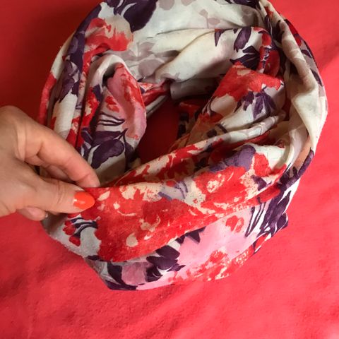 Kuvan tuubihuivi. Koko n.75x100x2. Ohut, läpikuultava materiaali. Miellyttävän pehmoinen iholla...