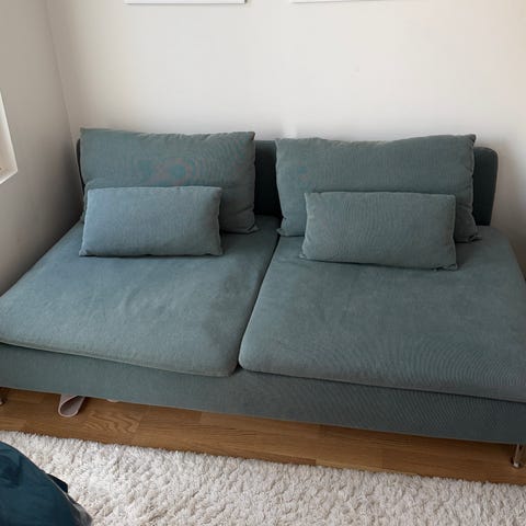 VARATTU. Muutoin täysin käyttökuntoinen ja hyvä sohva, mutta istuinsohvatyynyjen vetoketju kiinnityksistä vetoketjun vetimet irronneet kolmesta kohtaa, yksi edelleen paikallaan ja toimii. Istuinsohvatyynyt kuitenkin pysyneet ihan hyvin paikallaan myös ilman kiinnitystä.