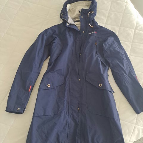 Erittäin hyväkuntoinen takki josta en löytänyt vikoja. Kiristys helmassa, kiristys hupussa, iso huppu joka suojaa sateelta. Vetoketju ja nepparilista. Taskuissa nepparikiinnitykset. Vetoketju ”povitasku”. Kaunis ja ihana takki, joka valitettavasti on jäänyt saliharrastuksen myötä liian pieneksi itselleni. Takin vaaleat karvat ovat omasta neuleestani, eivätkä eläimen karvaa. Yritin ottaa enimmät pois ennen kuvaamista.