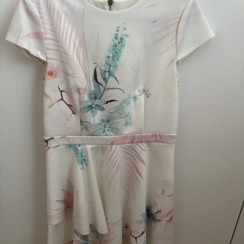 Mekko joustaa vähän ja takana vetoketju. Sivuilla taskut. Aivan ihana mekko vaikka kesän juhliin. Koko on 2 joka taitaa vastata kokoa 38, mutta sanoisin, että on kokoa S.