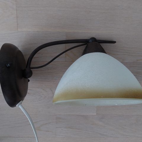 Kiiltävä valkoinen seinävalaisin kultaisella sisäpinnalla, varjostimen halkaisija 13 cm. Runko metallia, varjostin muovia, kanta E27, lamput eivät sisälly kauppaan. Johdossa katkaisija, johdon pituus n.2 metriä. Mahdollista asentaa seinän lisäksi myös kattoon. Valaisee hyvin, asennon vaihtaminen helppoa, pysyy asetetussa asennossa hyvin. Jämäkkä ja hyvin toimiva valaisin. Kiinnitetty kuvauksen ajaksi väliaikaisesti puurimaan. Hinta kahdesta seinävalaisimesta yhteensä 15 euroa.