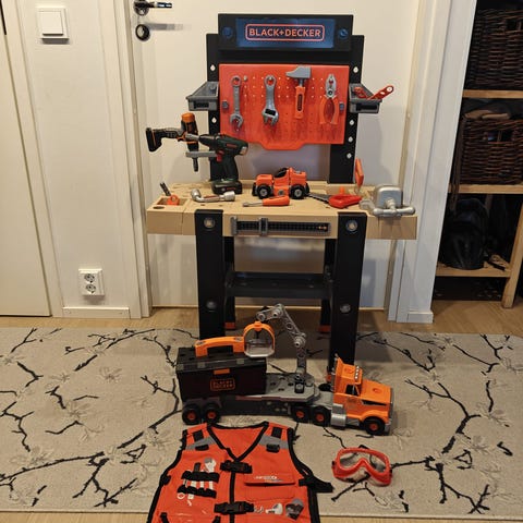 Huom! ALENNETTY hinta, koska pakkaus VÄHÄN KULUNUT 3032163602026 Yhdessä tuotteessa kolme toimintoa: Black+Decker-tyylinen lasten 3-in-1-rakennustyöpiste, joka muuntuu helposti työpöydäksi, kärryksi tai kottikärryksi ja sisältää työkalupakin sekä useita työkaluja ja tarvikkeita, jotka kehittävät lapsen kädentaitoja ja mielikuvitusleikkejä