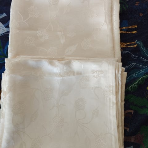 Kuin uudet,upeat sivuverhot. Pituus n.155 cm ja leveys ylhäältä levein kohta ( kapenee alaspäin) n.73 cm. Väri on hieman tummempi kuin kuvassa.