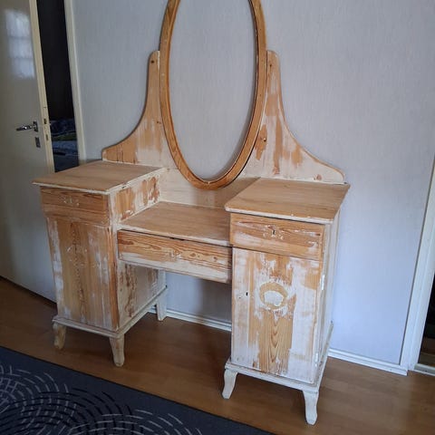 Valkea puinen kampauspöytä, jossa ovaalinmuotoinen peili ja koristeelliset kaiverrukset kultasävyisin yksityiskohdin. Pöydässä on yksi vetolaatikko ja kaarevat jalat. Pinta on kulunut ja maalipinnassa on naarmuja ja lohkeamia, ja peiliosan koristeissa näkyy halkeamia ja korjausjälkiä. Sopii esimerkiksi makuuhuoneeseen tai pukuhuoneeseen kampaus- ja säilytyskalusteeksi.