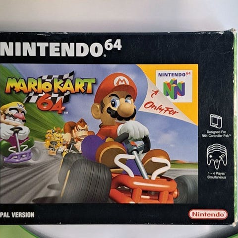 Mario Kart 64 Kuvien mukainen N64 paketti katso kuvat. laatikko: (NUKV) siisti, jämäkkä laatikko. Käyttö ohjeet (NUKA4) siisti, Suomen kielinen osio. Sisäpahvi: ehjä, siisti. Peli: siisti, toimiva. Maakoodi: EUR / NUS-EUR-1 / PAL VERSION - Peli toimii Suomi/Eurooppa Konsolissa.