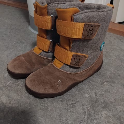 Erinomaisen kuntoiset Affenzahn wool comfy paljasjalkakengät. Uutena ostettu ja lapsi käytti näitä alkutalven kunnes kävivät pieniksi. Ainoa moite on pienehkö kärjen heijastimen kuluma, joka ei vaikuta kengän teknisiin ominaisuuksin.