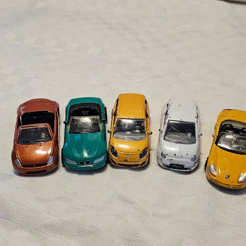 Myydään erittäin hyväkuntoiset, hyvin vähäisille leikeille jääneet ja lähinnä hyllyllä olleet 10 cm pituiset metalliset pikkuautot 5 kpl yhteishintaan. Mukaan saa halutessaan samaa kokoluokkaa olevan muovisen poliisiauton.