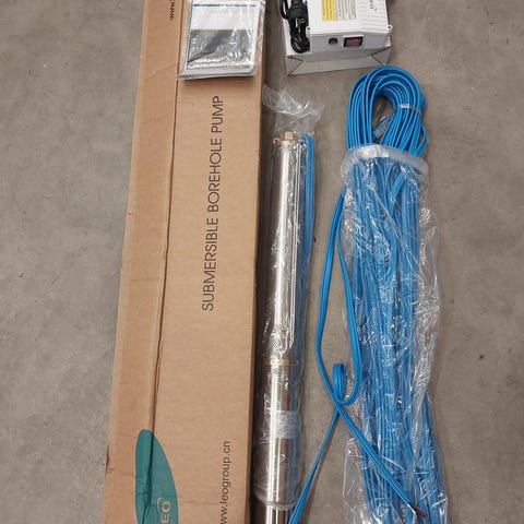 Varastontyhjennyserä, 2kpl avaamattomissa paketeissa olevia porakaivopumppuja. Laatikko sisältää kaapelin, ohjainyksikön, ohjeet sekä pumpun.