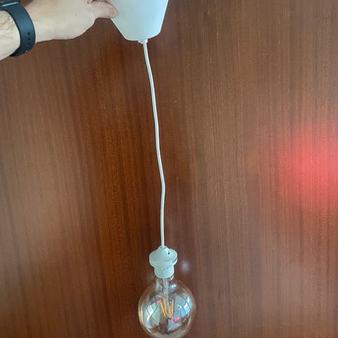 Vanha punainen lampunvarjostin kultaisella lamppuosalla. Jonkun verran repeämää niinkuin kuvasta näkyy.