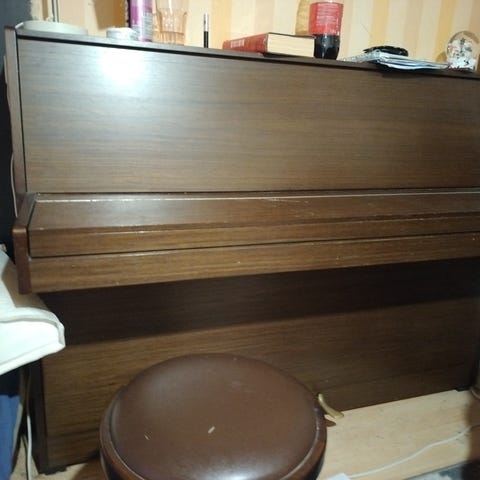 Akustinen pystypiano, jossa puuviimeistely ja täysikokoinen koskettimisto. Sopii kotiin tai harjoittelukäyttöön. Kuvissa näkyy yksinkertainen, suoraviivainen muotoilu ja perinteinen jalkarakenne. Mukana erillinen pianotuoli kuvien mukaisesti, jos myyjä niin ilmoittaa.