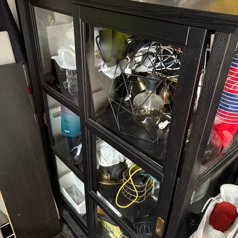 Myydään ruskea lasivitriinihylly, jossa kaksi lasiovea ja yksi puinen ovi, hylly varustus.