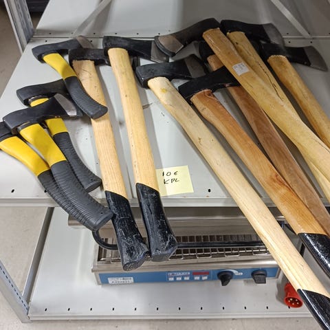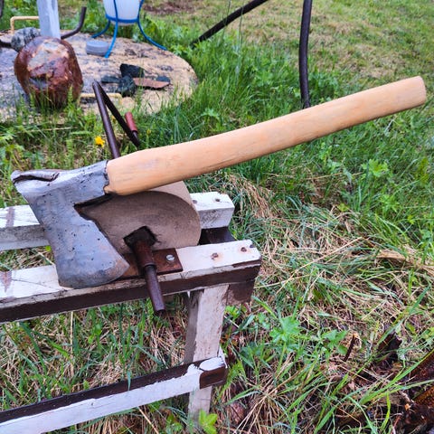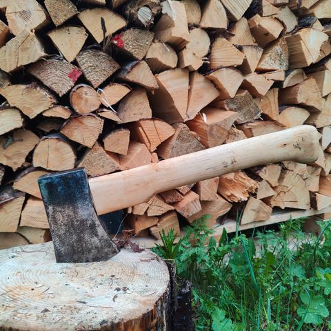 Kotimainen kirves, 60cm pitkä. Terä kaipaa perusteellista teroitusta.