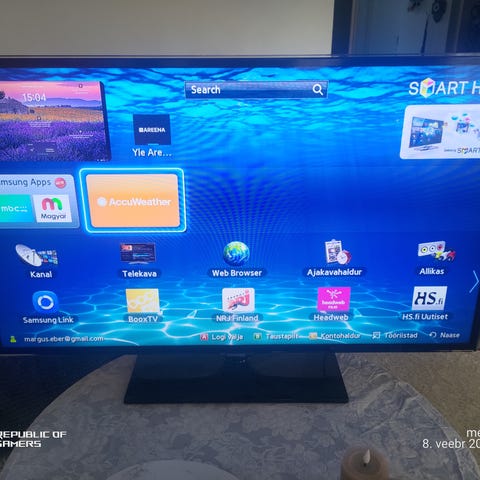 Samsungin 50" älytelkkari. Tähän saa appeina netflixin, youtuben, spotifyn jne. Parista kuvasta näkyy jostain tähän tippunutta maalia, mutta muuten laite on erinomaisessa kunnossa. Mukana kaukosäädin ja laitteen oma virtapiuha. Alkuperäinen laatikko tallella, jossa laitteen saa mukaansa.