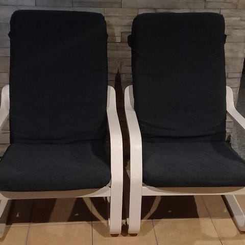 Kaksi lepotuolia, jotka saa säädettyä helposti eri asentoihin. Toisessa tuolissa pieni reikä kankaassa. Muuten kunto hyvä. Väri sini-harmaa. Myydään myös erikseen 80€ kpl.