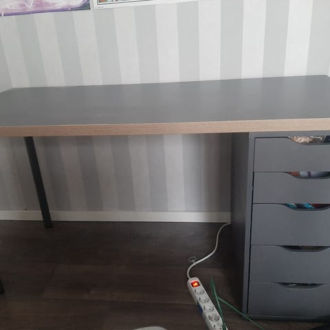 Hyväkuntoinen, harmaa, kolme laatikkoa, metallijalat.