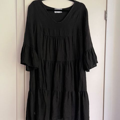 ByPias arkimekko naisille, koko XL. Beige, yksivärinen mekko, materiaalina 100 % pellava. Mallissa on väljä leikkaus, 3/4-pituiset hihat ja etupuolella paikkataskut. Pyöreä pääntie, takana nappikiinnitys. Soveltuu arkipukeutumiseen ja kerrospukeutumiseen.