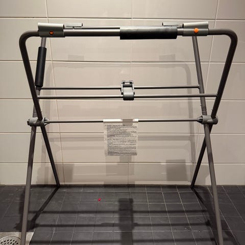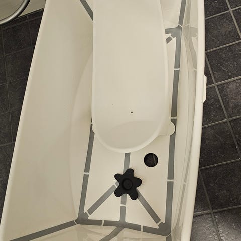 Stokke Flexi Bath -vauvankylpyamme telineellä. Kylpyamme on läpikuultavan valkoinen sinisillä tukirakenteilla ja mukana tulee erillinen jalallinen teline, joka nostaa ammeen sopivalle pesukorkeudelle. Tämän kanssa ei väsy selkä kylvettäjällä ja on helpompi pitää vauva otteessa. Ammeessa on pohjassa tyhjennystulppa ja poistoletku veden laskemista varten. Tuote soveltuu vauvan ja pienen lapsen kylvettämiseen kotikäytössä. Pakettiin kuuluu kokoontaitettava amme, metallinen teline sekä kuvissa näkyvä vauvan kylpytuki. Nouto.