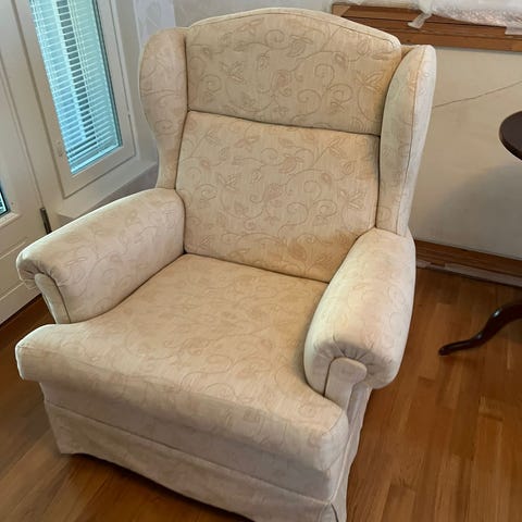 Ajatuksena pestä tuoli tekstiilipesurilla vielä, joten nouto ei onnistunut samantien. Jos haluat tuolin ilman pesua hintaa voidaan laskea 30€.