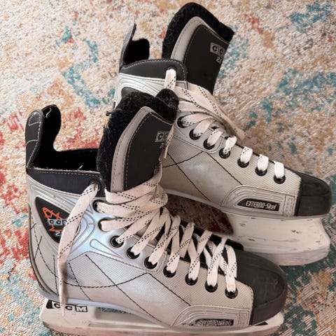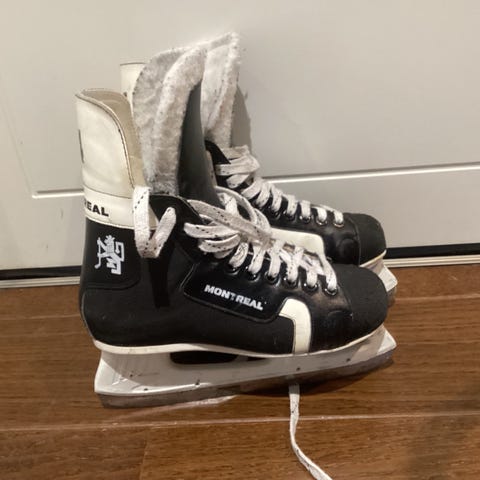 Montreal jääkiekkoluistimet, koko 44. Väri musta-valkoinen. Perinteinen jääkiekkoluistin, jossa korkea varsi ja nauhakiinnitys. Terät kiinnitetty valkoisiin teräkoteloihin. Sopivat jääkiekkoharjoitteluun tai yleiseen luisteluun oikean kokoiselle käyttäjälle.