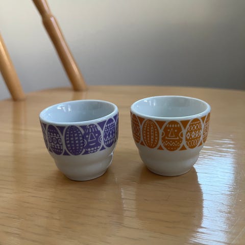 Yhdestä kupista puuttuu pala yläreunasta.