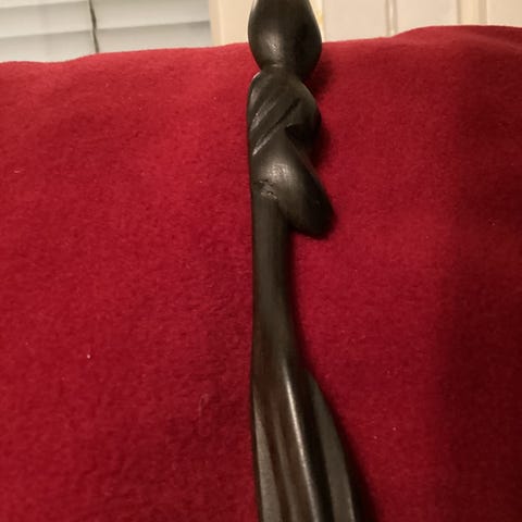 Persoonallinen puuveistos, jossa on seisova tonttu, tai peikkohahmo punaisella lakilla. Hahmolla on pitkä nenä, avoin suu ja veistetyt hiukset sekä parta. Veistos on luonnonväristä puuta, jalat ja kädet on muotoiltu karkealla veistotekniikalla. Korkeus noin 20 cm.