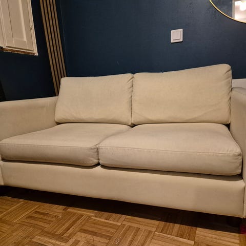 Päätimme vaihtaa lapsiperheelle hieman käytännöllisempään väriin ja meiltä jäi ylimääräiseksi kaksi sohvaa, tässä isompi.