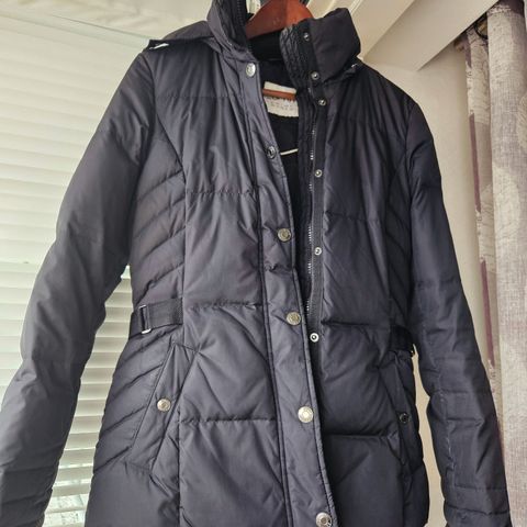Esprit naisten talvitakki, koko L. Puolipitkä malli, väri musta. Takissa on tikattu pinta ja edessä vetoketju sekä painonapit. Hupussa ja kauluksessa on pehmeä, karvamainen vuori lisälämpöä varten. Soveltuu kylmän sään ulkoiluun ja arkipukeutumiseen.