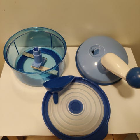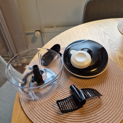 Tupperwaren punainen monitoimikulho kaikkine lisäosineen. Hyvässä kunnossa eli toimii kuten pitää. Käsikäyttöinen.