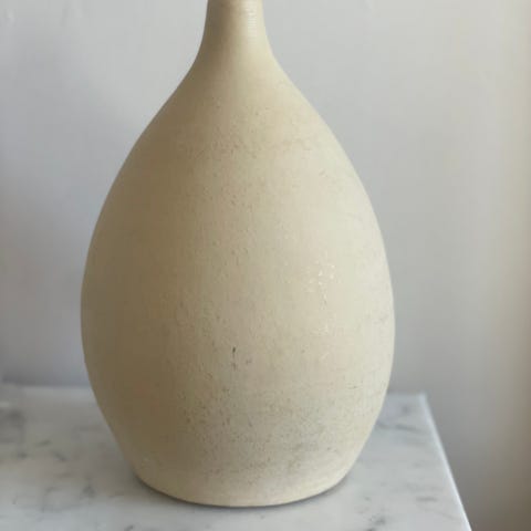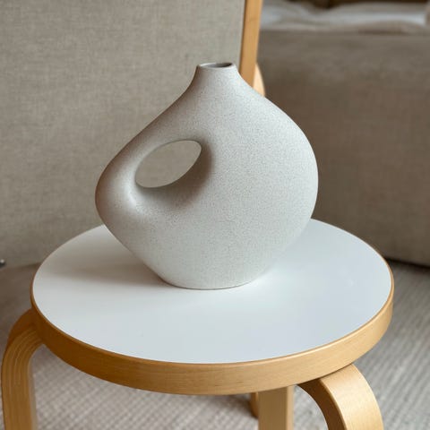 Myydään tyylikäs valkoinen kivikeraaminen maljakko. Ajaton, uritettu muotoilu sopii hyvin skandinaaviseen sisustukseen.