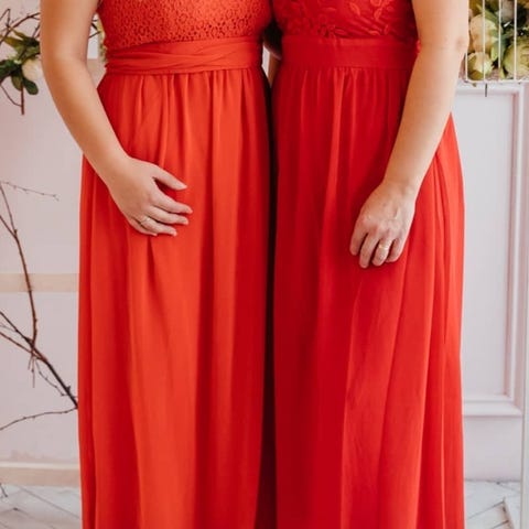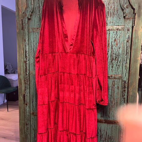 Punainen pitkä merenneitomekko. Hihat voi pukea ylös harteille tai alemmas käsivarsien ylle. Kaula-aukon reunassa silikoninauha pitämässä kangasta paikoillaan. Takana vetoketju. Kangas venyy.