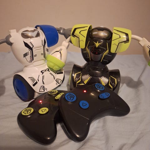 Silverlit kauko-ohjattavat robottilelut, kaksi robottia ja kaksi ohjainta. Toinen robotti on pääosin valkoinen sinisillä yksityiskohdilla ja toinen musta vihreillä yksityiskohdilla. Molemmissa roboteissa on pyörillä varustettu alusta ja liikkuvat käsivarret. Mukana tulevat erilliset käsiohjaimet, joissa on värilliset painikkeet robottien ohjaamiseen. Paristokäyttöiset lelut, sopivat robottiaiheisiin leikkeihin ja kaksintaisteluleikkeihin sisätiloissa. Paristot mukaan.