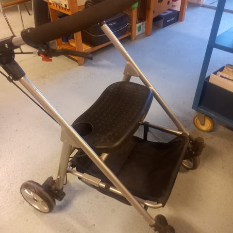 Rollaattori, jossa on suuret etu- ja takapyörät helpottamaan liikkumista epätasaisilla alustoilla. Runko on vaalea ja istuinosa tummanharmaa. Rollaattorissa on työntökahvat, jarrut ja istuinlevy taukoja varten. Laite on kokoontaitettava säilytystä ja kuljetusta varten. Soveltuu aikuisen liikkumisen tueksi sisä- ja ulkokäyttöön. Hyväkuntoinen.