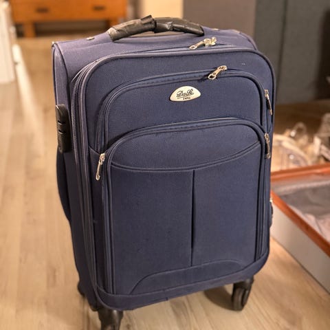 Two suitcases (dark blue Samsonite, another one in black unknown brand), both are hardshell large suitcases.