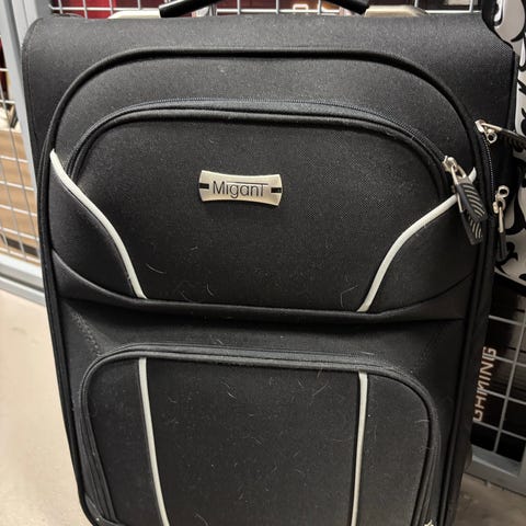Violetti kovakantinen lentolaukku. Muuten ok mutta käytön jälkiä paljon ja kahva jumittaa välillä. (Tyypillistä migantin laukuille) Täysikokoinen saman värinen laukku myös myynnissä, (kysy lisää jos haluat ostaa molemmat.)