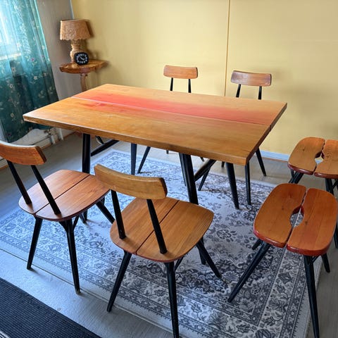 Tuoleissa on havaittavissa kulumaa ja naarmuja pinnoilla, erityisesti jaloissa ja istuinosassa. Pöydässä kuluma pinnoitteessa (haalistuma) sekä käytön jälkiä tasossa. Runkoehjä kokonaisuus, joka kaipaisi hieman rakkautta.