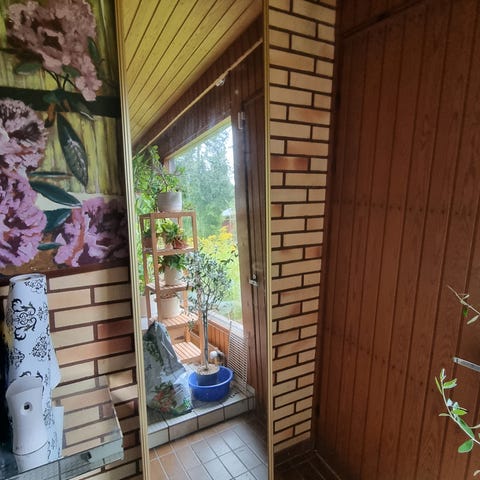 Kuvan mukainen peilikaapin ovi saranoineen. Muuten virheetön, mutta sisäpuolen peilin liimaus pettänyt. Voi liimata takaisin tai käyttää normaalipeilinä.