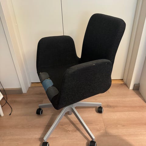 Ulkomaille muuton takia säädettävä työtuoli annettavaksi. Säädettävä istuinkorkeus 38-50cm, istuimen koko 35x32cm