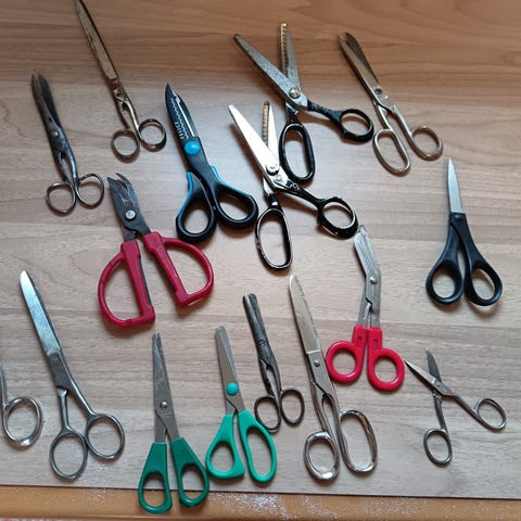 Itseommeltu saksipussi/saksikotelo, jonka saa roikkumaan yläosan ripustuslenkistä.