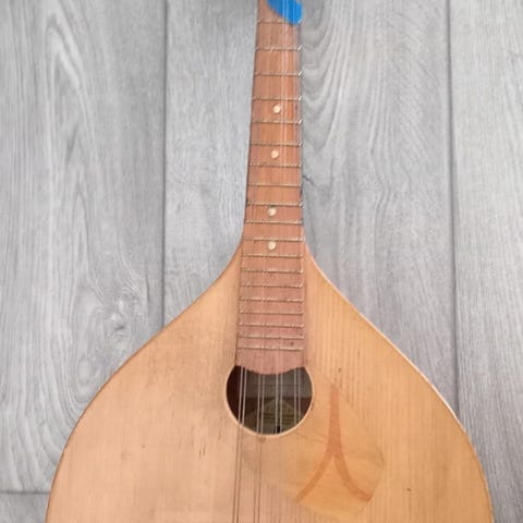 Kieletön mandoliini. Muuten ehjä ja hyväkuntoinen.