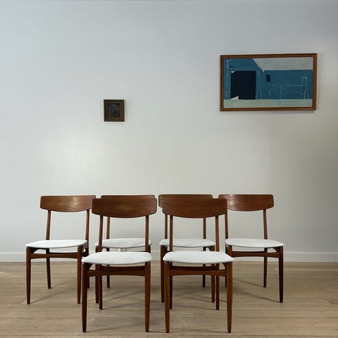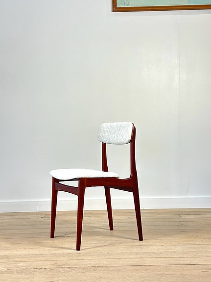 Tanskalaiset 1960 -luvun tiikkiset ruokatuolit. Tuolit ovat uudelleen kunnostetut ja istuimet verhoiltu siistillä vaalealla kankaalla.