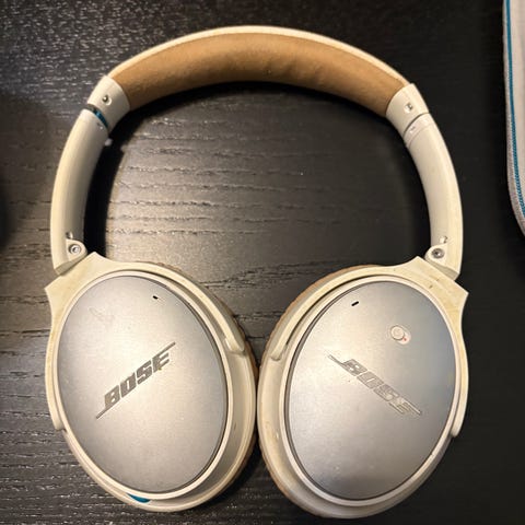 Toimivat langalliset Bosen kuulokkeet. Vasemmassa padissa pientä halkeilua. Uudet kuulokesuojat maksaa n. 10€ jos tälläiset haluaa ostaa uudet. Vastamelu toimii AAA-paristolla.