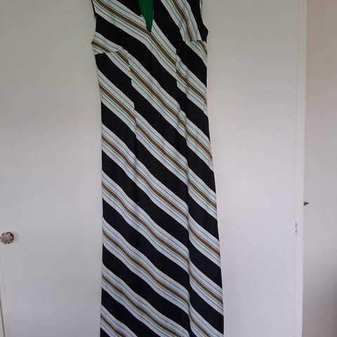 Naisten Vintage ilta- tai juhlapuku, koko S. Mekko on sininen ja valmistettu akryylista. Mallissa on lyhyet, väljät hihat, V-pääntie ja pitkä helma. Takana on vyö, jolla vyötäröä voi säätää. Sopii juhla- ja iltatilaisuuksiin. (tekoälyllä muokattu)