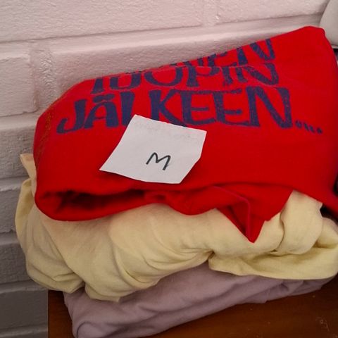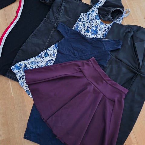 Moitteettomassa kunnossa olevia, näyttäviä vaatteita. Housut, mekko, kaksi toppia ja paita.