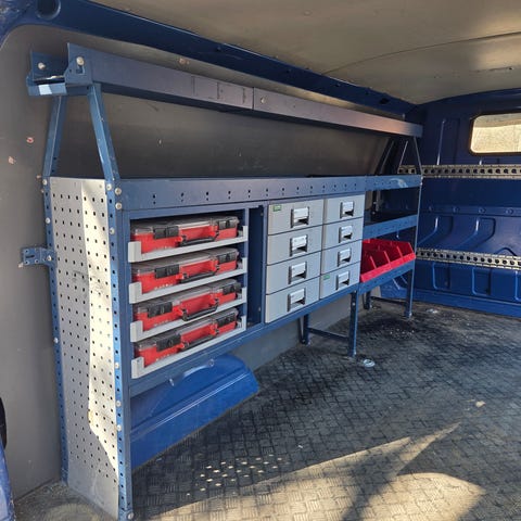 Modul systemaattisesti, hyllyt ja laatikosto pakettiautoon, hyllyn pituus 130cmx 32,5 ja hylly+ laatikosto 180x 30,cm tai irroitettuna laatikosto 78 cm x30cm ja hylly 100x30 cm eli 3 hyllyä ja laatikosto