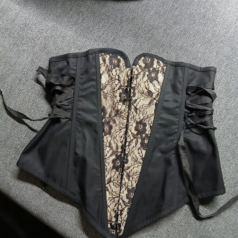 Vähän käytetty, moitteeton ja laadukas overbust korsetti. Yltää lantiolle, joten luo kauniin siluetin koko torsolle. Lantiolla mustat helminauha-yksityiskohdat. Kangas läpinäkyvä, verkkomainen. Tällä saa vyötärön todella kapeaksi ilman että povi&lantio puristuu liioin! Näyttää kauniilta myös ohuiden paitojen ja mekkojen päällä.
