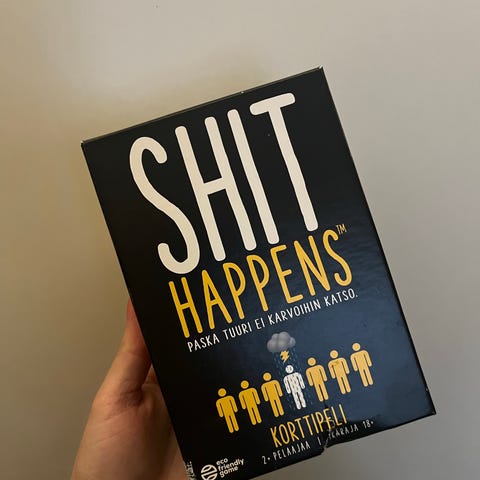 Shit Happens -korttipeli. Peli on suunniteltu useammalle pelaajalle ja sisältää kortteja, joissa on erilaisia tilanteita pisteytyksineen. Soveltuu ajanviettoon esimerkiksi ystävien tai perheen kanssa. Ikäsuositus ja tarkempi pelaajamäärä löytyvät pelilaatikon kyljestä tai ohjeista.