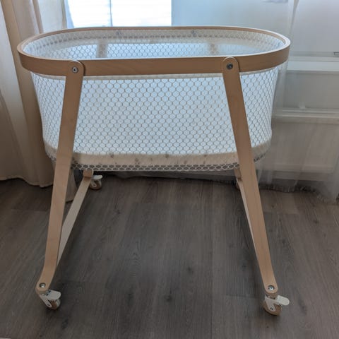 Myyn kehdon kokonaisena: mukana tulee sekä runko että alkuperäinen sieni/sisäpatja. En pura osiin – helppo ja nopea nouto.